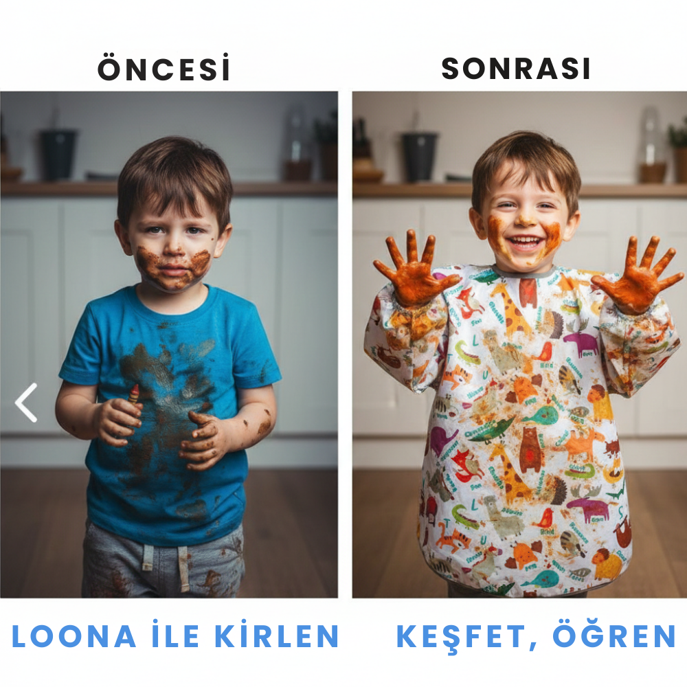 Boyamasını, üretmesini, denemesini istiyorsun Ama aklından geçen tek şey “sonrası” oluyor. Hangi kıyafet kirlenecek, nereye bulaşacak, ne kadar temizlik çıkacak? Loona bu düşünce zincirini kırmak tasarlandı. Çocuğun özgürce oynarken, sen sürekli tetikte olmak zorunda kalmazsın. Kıyafetler kaosa dönüşmeden, çocuğun oyununu tamamlar. Loona ile yeni aktiviteler artık gözünde büyüyen bir şey değil, gerçekten keyifli bir ana dönüşsün.
